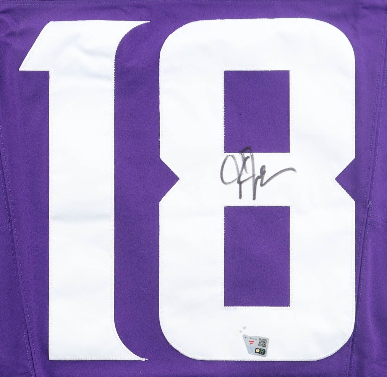 Nike jersey with everything sewn on, size 48. Hand-signed by Justin Jefferson (Minnesota Vikings). Please note, there are stray ink marks above the hologram.