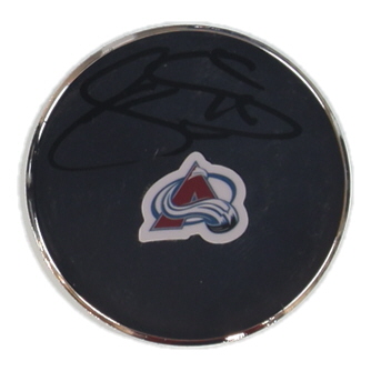 Colorado Avalanche logo chrome hockey puck has been hand-signed by Joe Sakic (HOF).