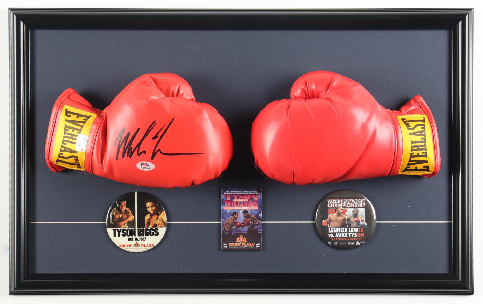 Custom frame measures 17" x 26" in size and features a set of (2) Everlast boxing gloves that have been hand-signed by Mike Tyson (HOF). Display also includes (3) original fight pins. Please see photos for details regarding the condition of the item.