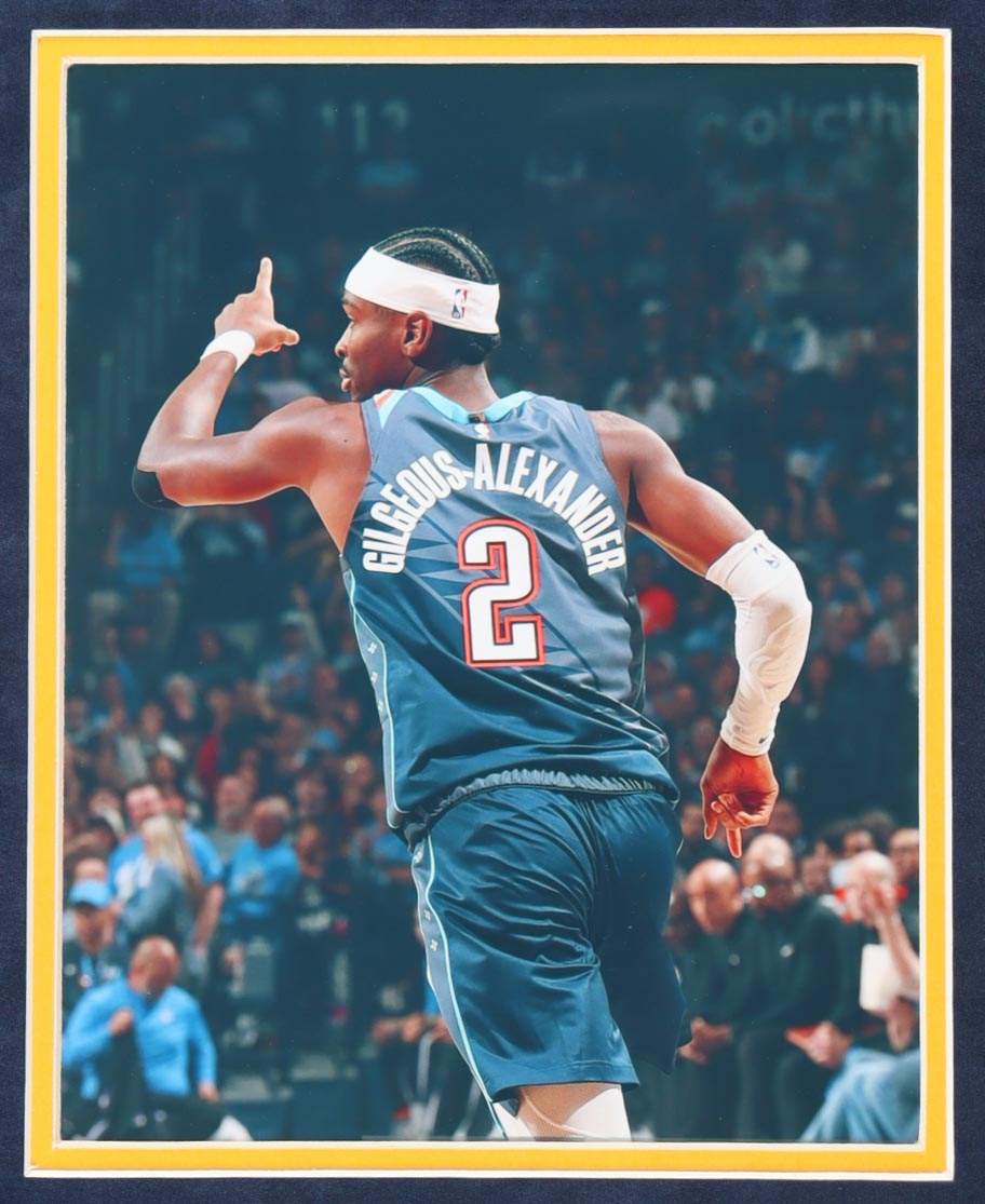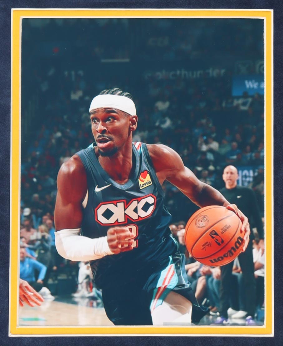 Custom frame measures approximately 32.5" x 39.5" in size and features an authentic jersey that has been hand-signed by Shai Gilgeous-Alexander (Oklahoma City Thunder). Display also includes (2) unsigned 8" x 10" photos.