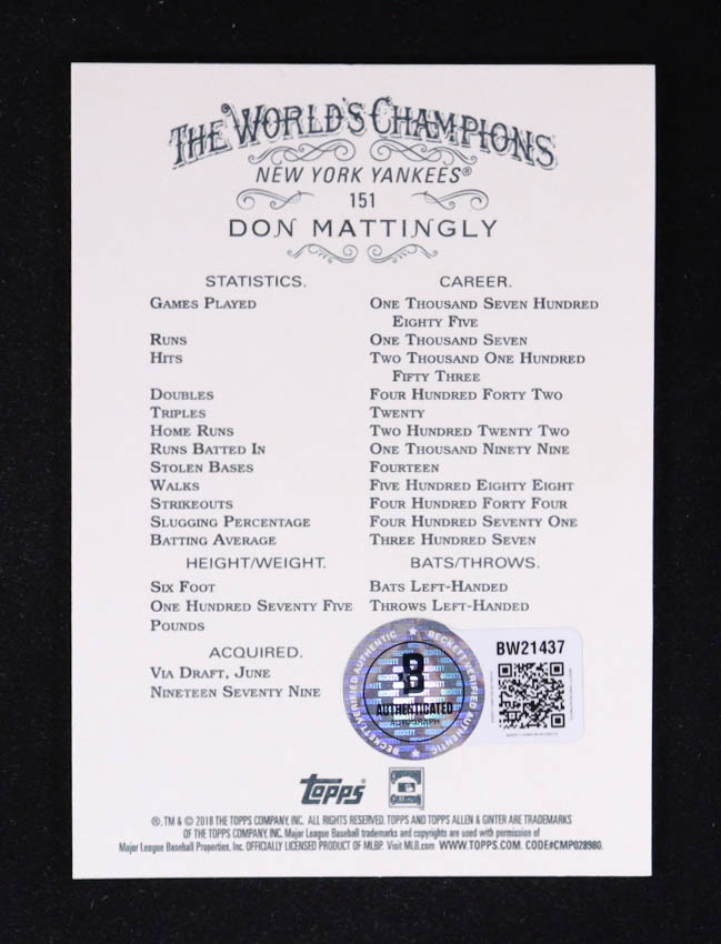 Don Mattingly Signed 2018 Topps Allen and Ginter #151 (Beckett)