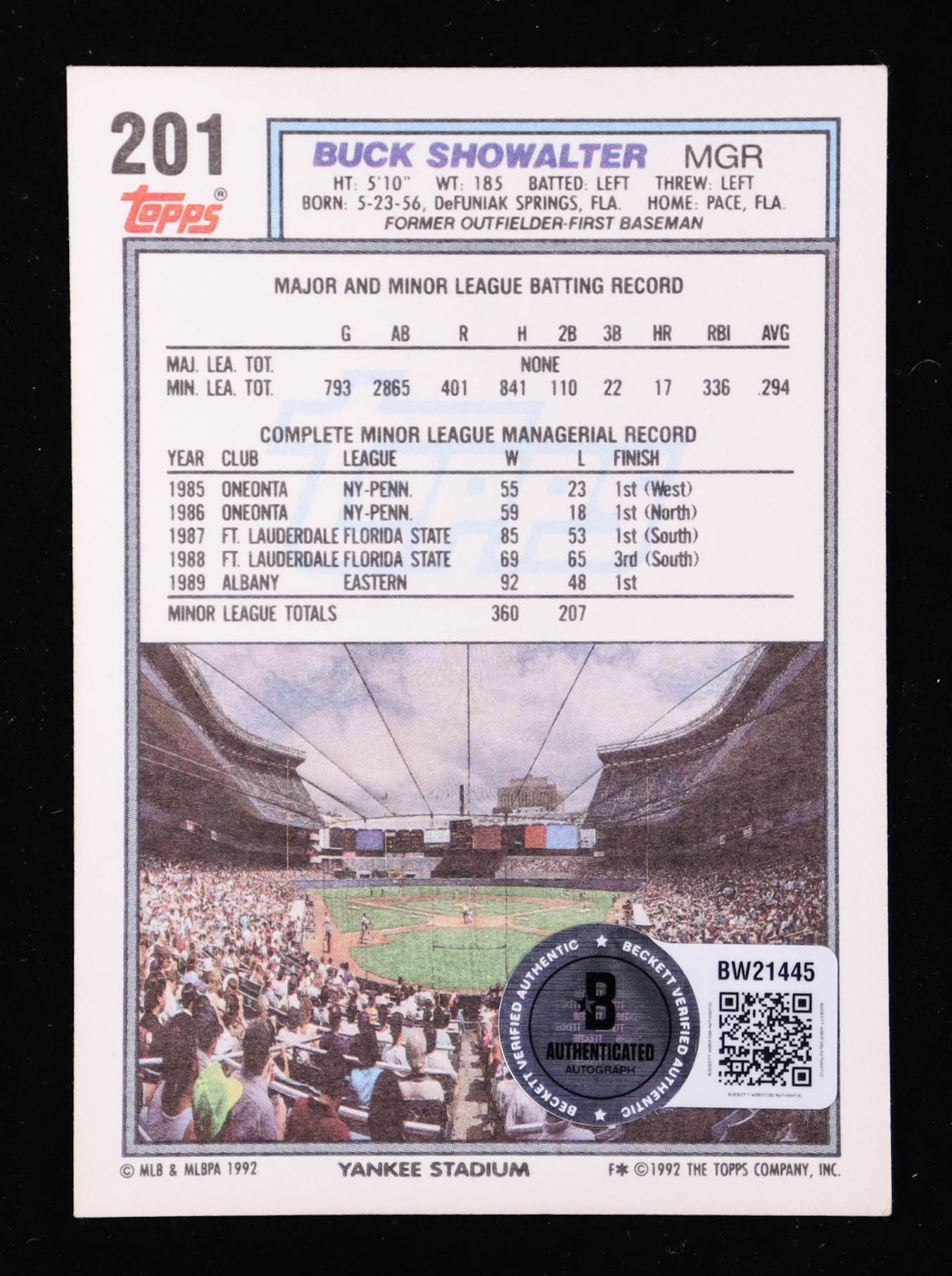 Buck Showalter Signed 1992 Topps MG #201 RC Inscribed "4x MOY" (Beckett)