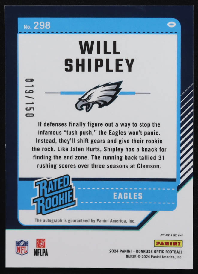 Will Shipley 2024 Donruss Optic Rated Rookies RPS Autographs Holo #298 RC #19/150