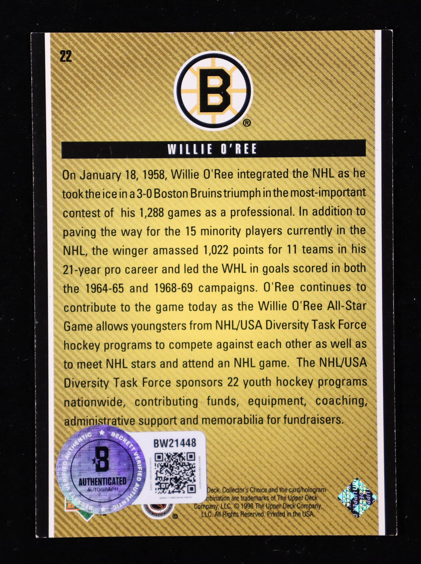 Willie O'Ree Signed 1998 Upper Deck Willie O'Ree Commemorative Card #22 (Beckett)