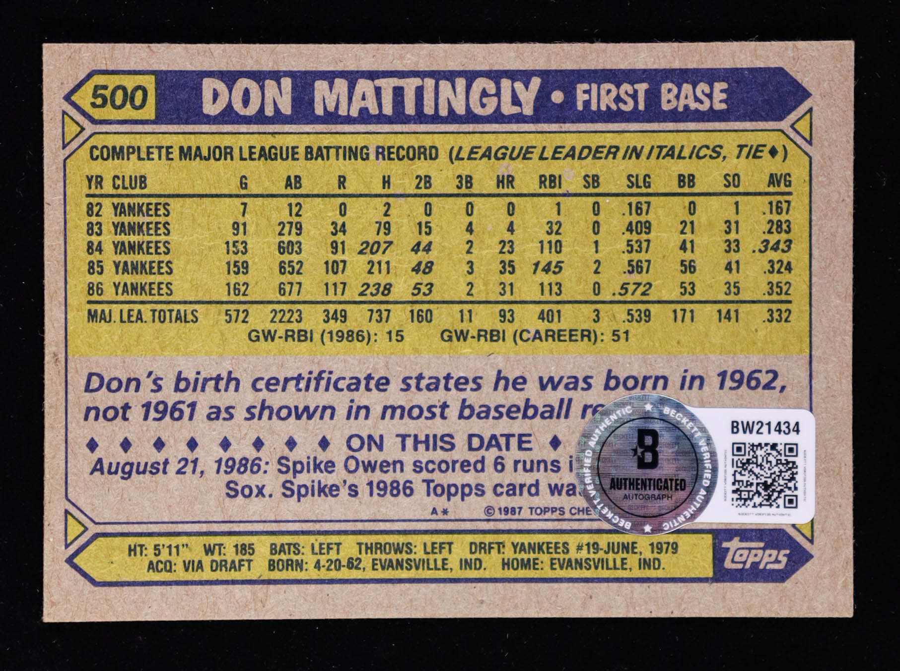 Don Mattingly Signed 1987 Topps #500 (Beckett)