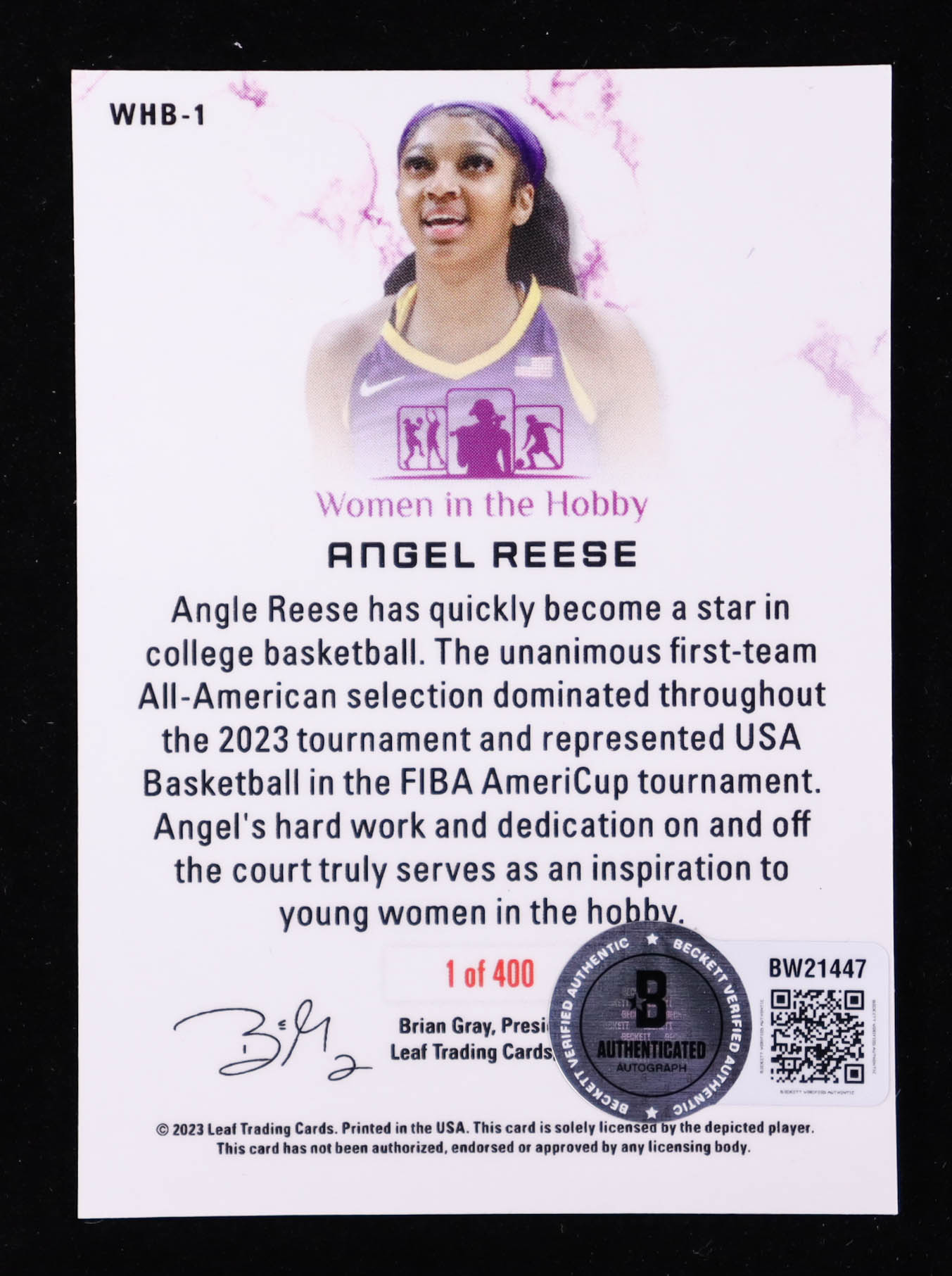 Angel Reese Signed 2023 Leaf Women in The Hobby #WHB1 #/400 RC (Beckett)