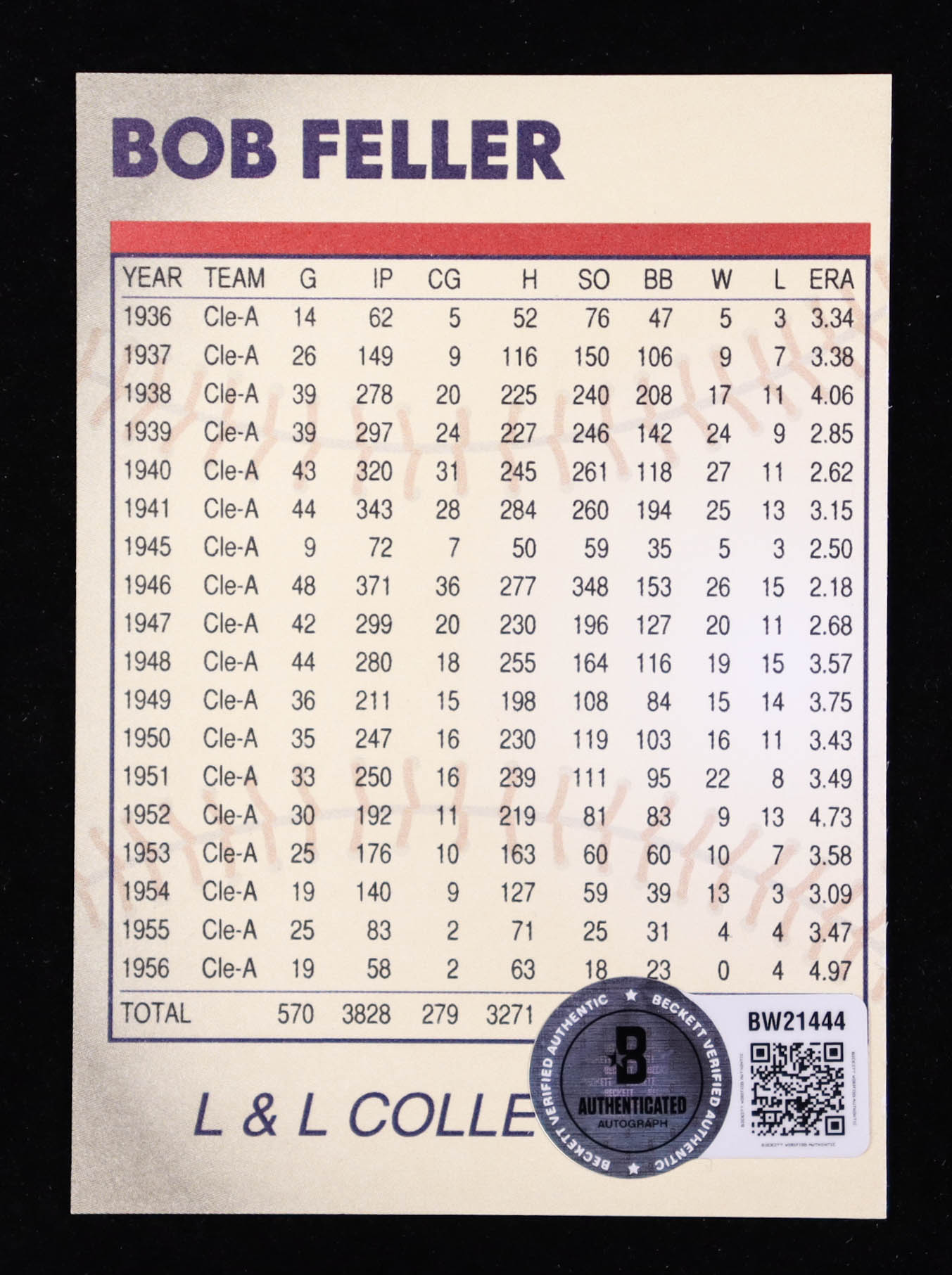 Bob Feller Signed L & L Collectibles #NNO (Beckett)