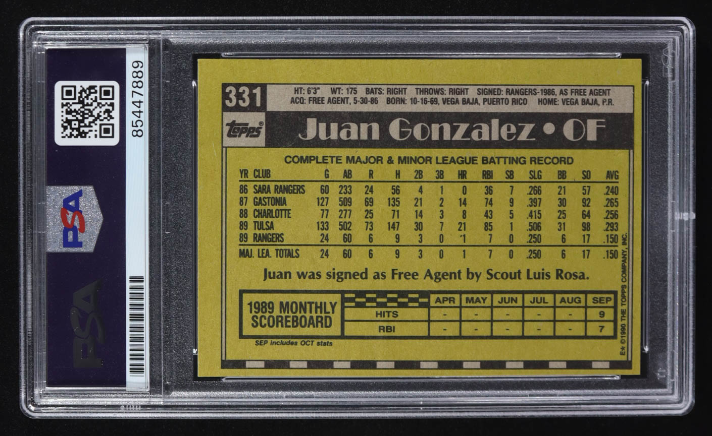 Juan Gonzalez Signed 1990 Topps #331 RC "2x M.V.P" (PSA)