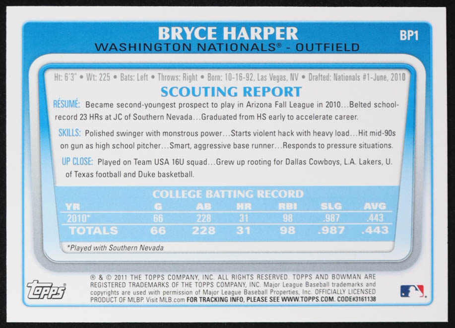 Bryce Harper 2011 Bowman Prospects #BP1 RC