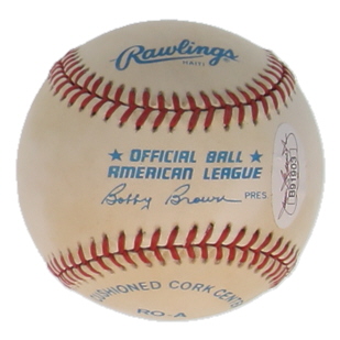 Rawlings Official American League Baseball. Hand-signed by Bob Feller (D. 2010, Cleveland Indians, HOF). Please note, the baseball is naturally toned and stained.