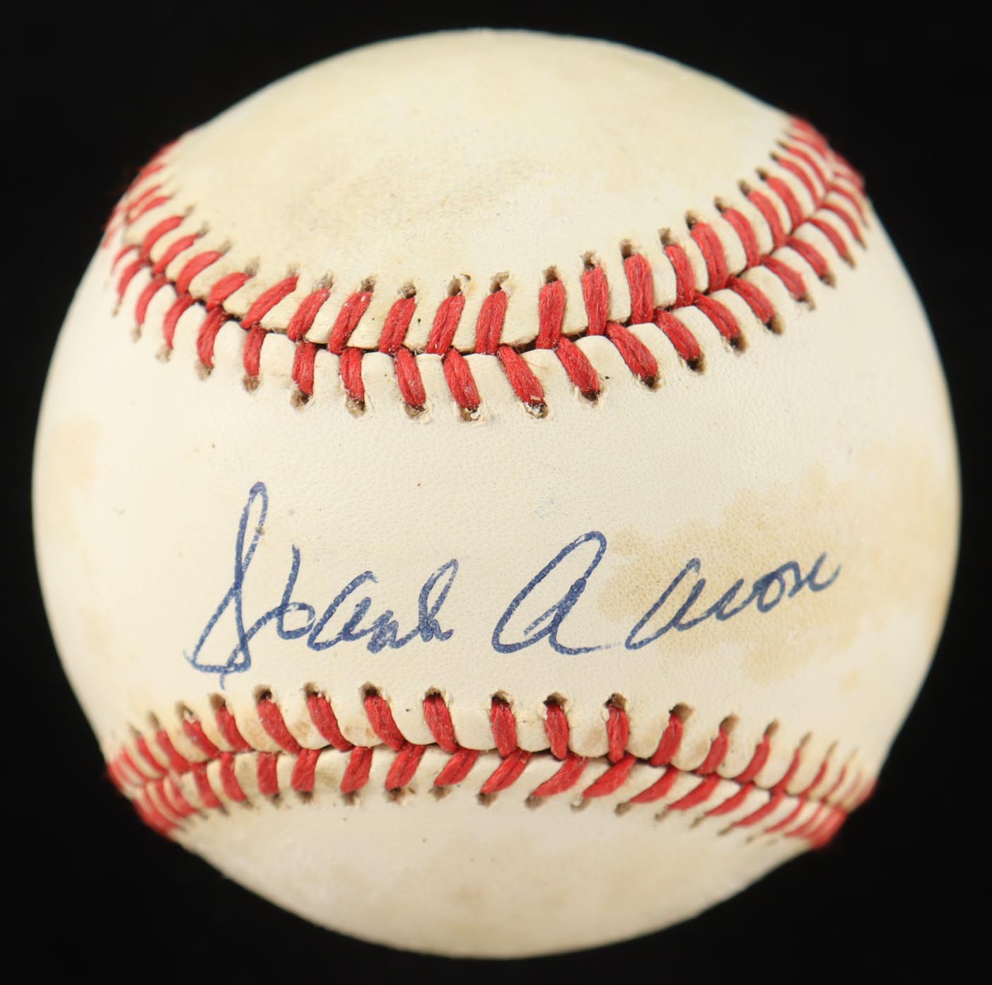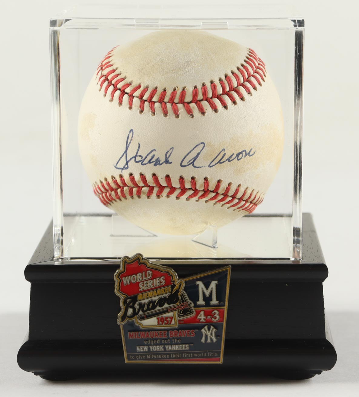 Rawlings Official National League Baseball. Hand-signed by Hank Aaron (D. 2021, Atlanta Braves, HOF). Note that the display case and 1957 World Series pin are included in the listing. Please see photos for more details regarding the condition of the item as the baseball shows signs of natural toning and staining.