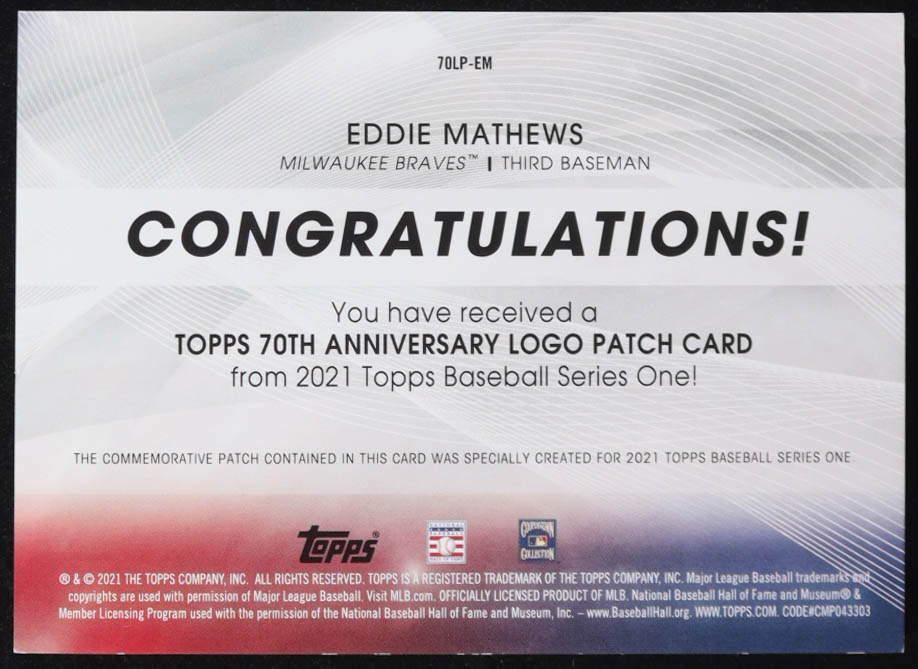 Eddie Mathews 2021 Topps 70th Anniversary Commemorative Logo Patches #70LPEM