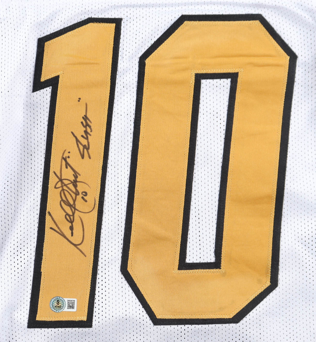 Custom jersey. Everything is sewn on, size XL. Hand-signed and inscribed by Kordell Stewart. Please note, glue is visible through the reverse number.