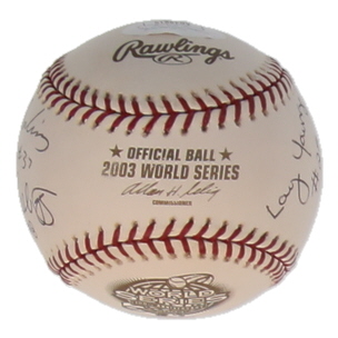 2003 World Series logo baseball has been hand-signed by Tim Welke, Randy Marsh, Larry Young, Ed Rapuano, Gary Darling, and Jeff Kellogg.