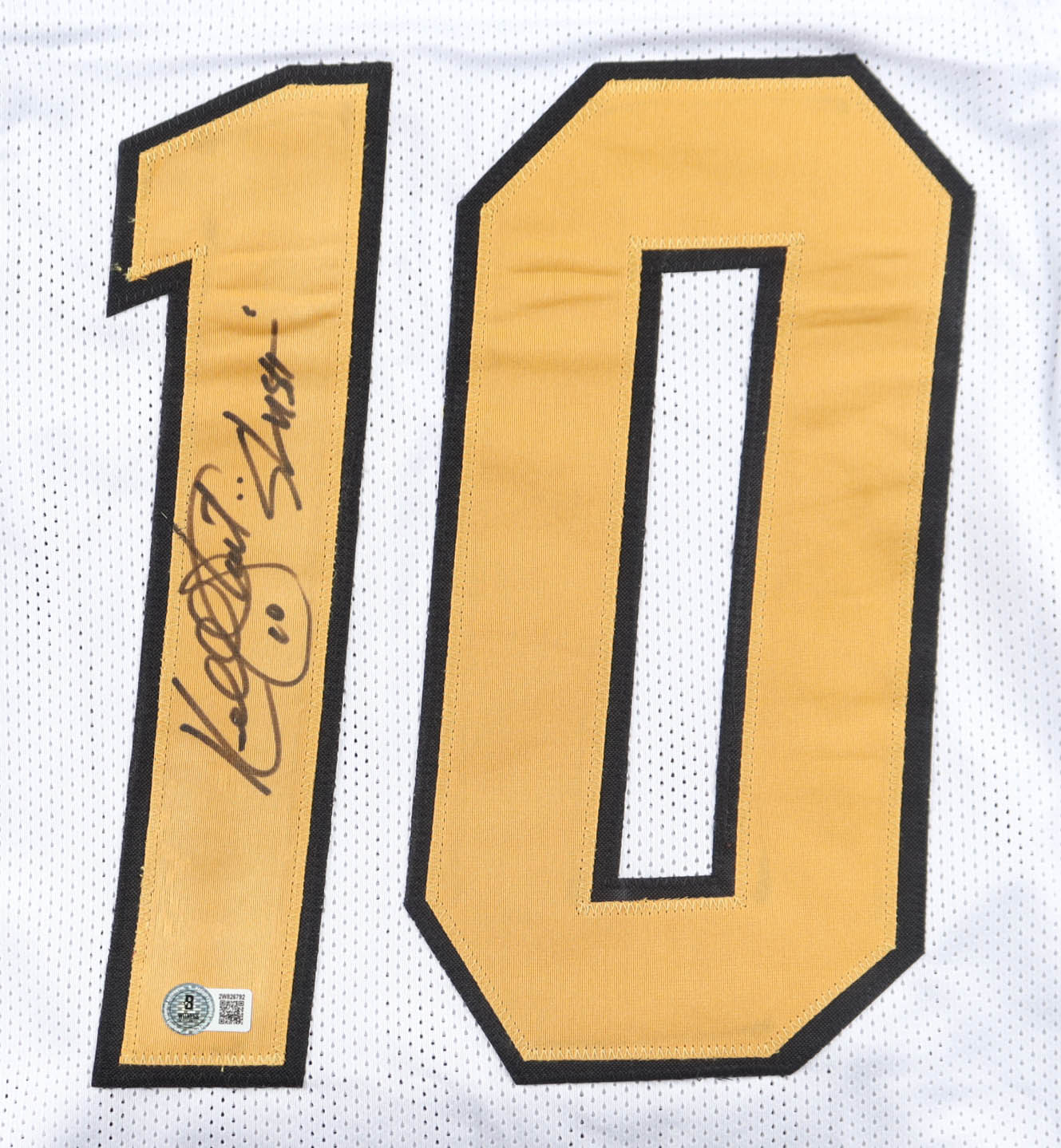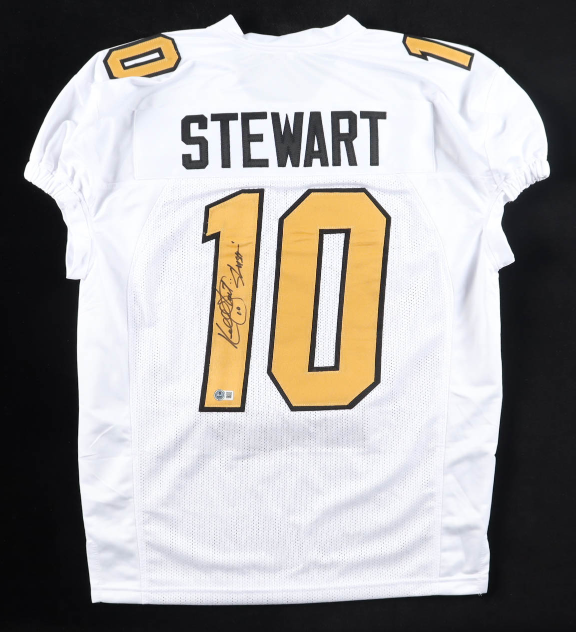 Custom jersey. Everything is sewn on, size XL. Hand-signed and inscribed by Kordell Stewart. Please note, glue is visible through the reverse number.