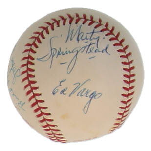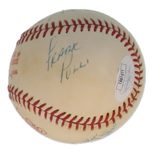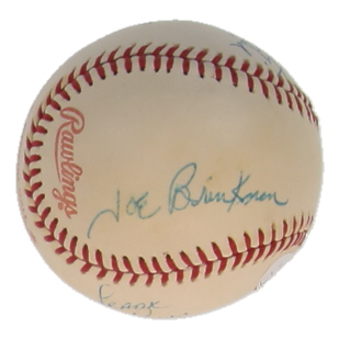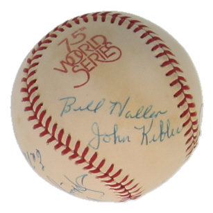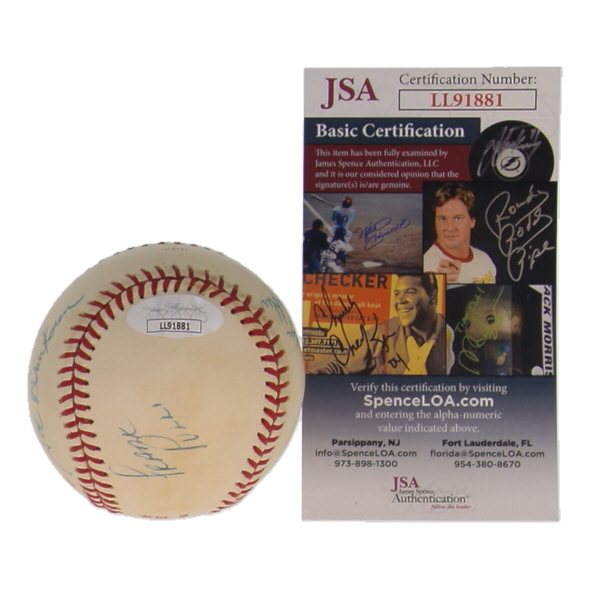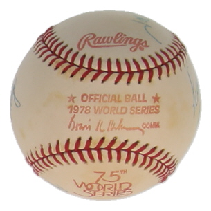 Rawlings 1978 World Series logo baseball has been hand-signed by Frank Pulli, Joe Brinkman, Ed Vargo, Marty Springstead, Bill Haller, and John Kibler.
