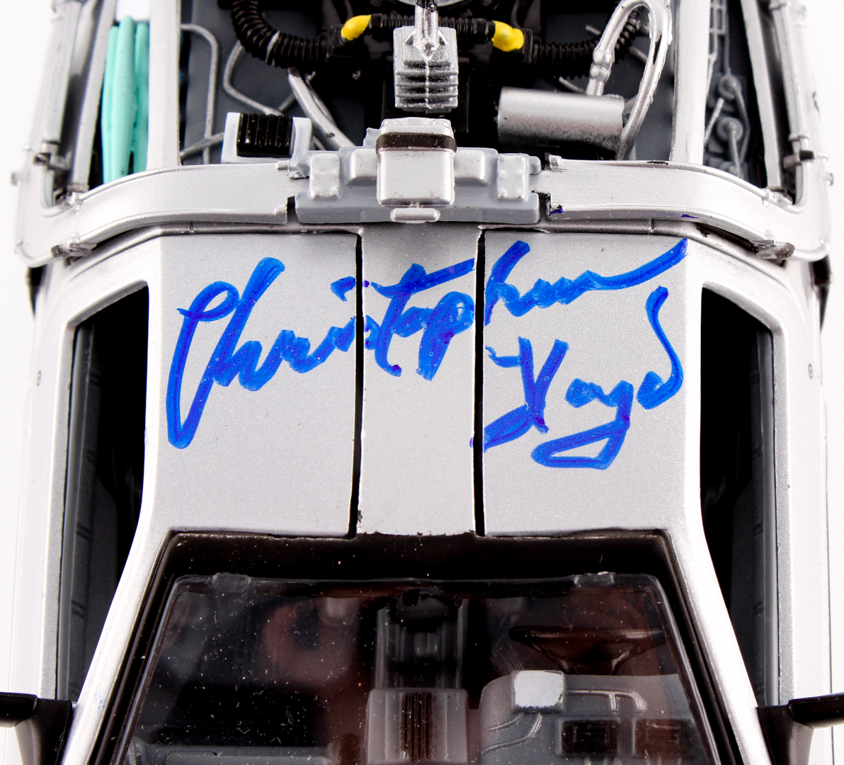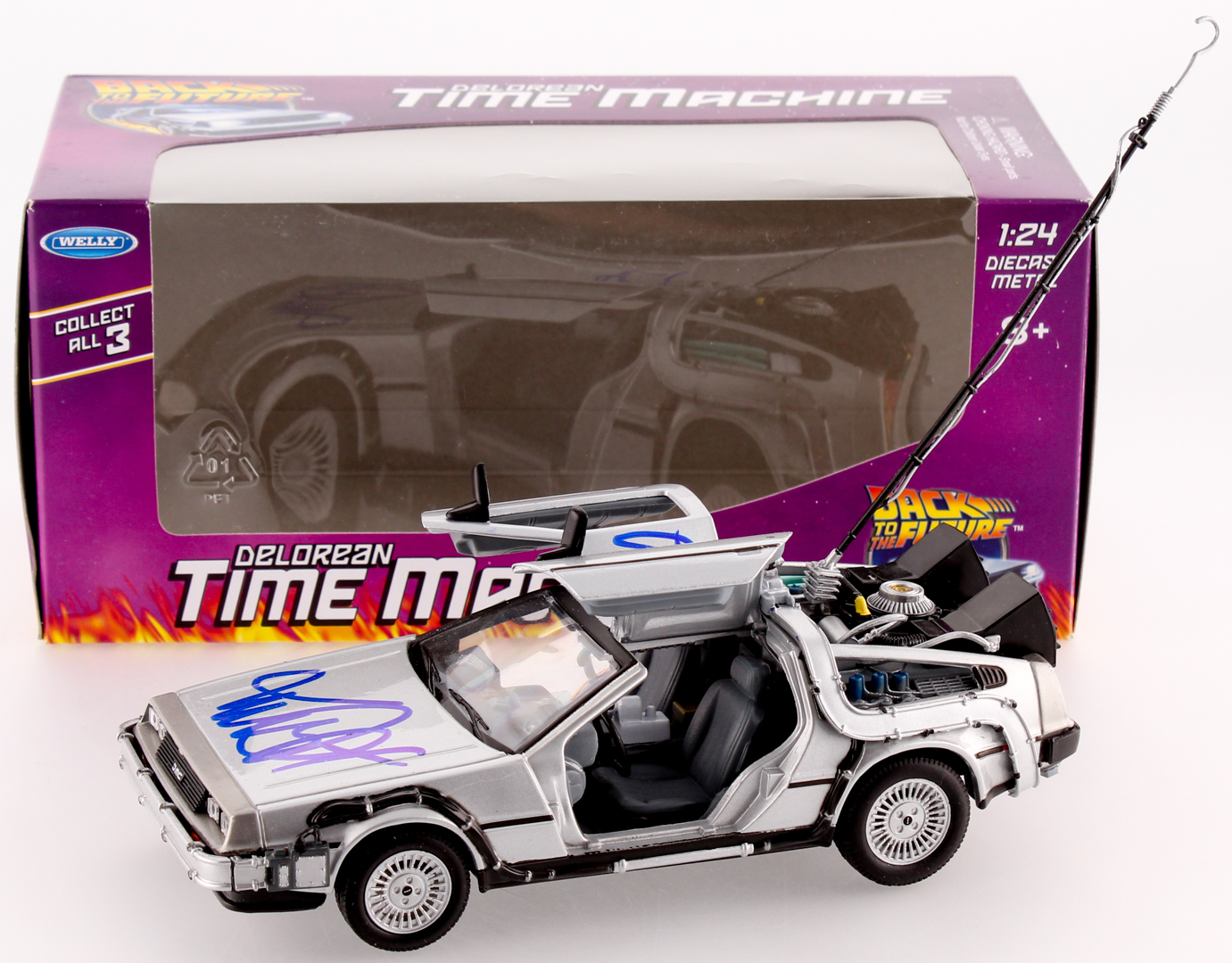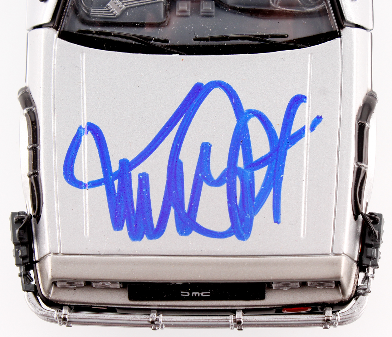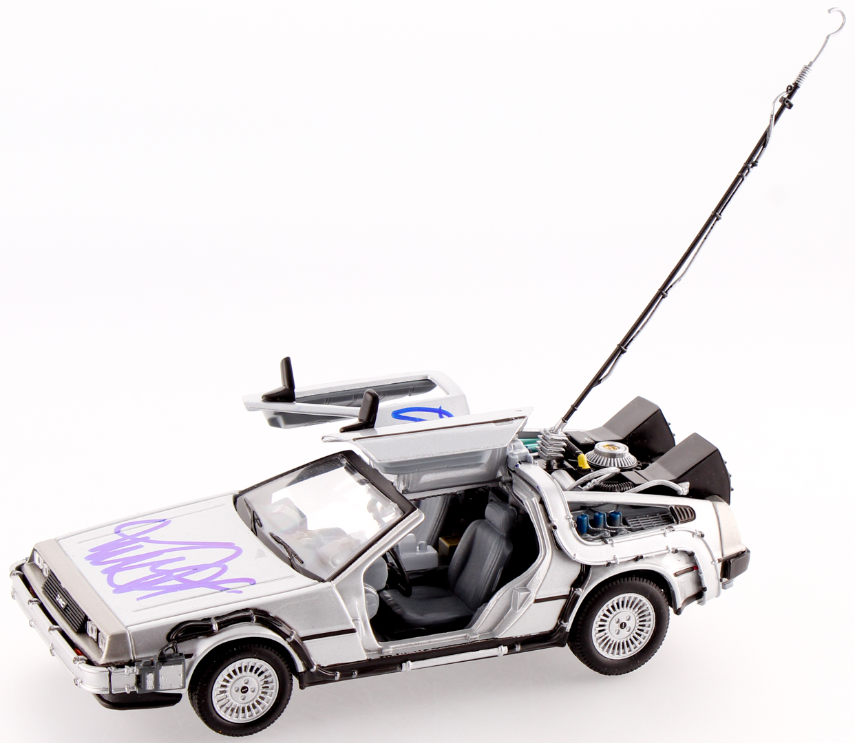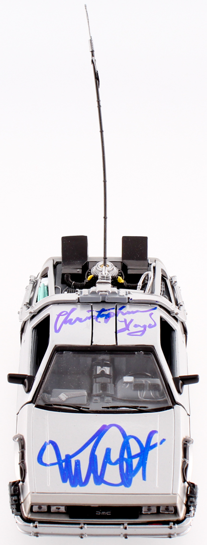 DeLorean 1:24 Scale Diecast Model Car. Hand-signed in blue felt-tip pen Michael J. Fox (Marty McFly) and Christopher Lloyd (Emmett "Doc" Brown).