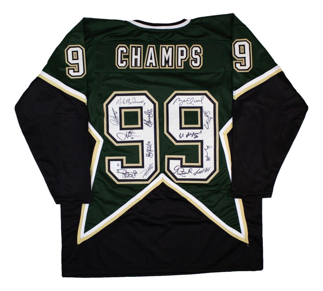 Custom jersey with everything sewn on, size XL. Hand-signed by (13) members of the 1999 Dallas Stars including Brett Hull, Mike Modano, Ed Belfour, Sergei Zubov, Guy Carbonneau, Derian Hatcher, Joe Nieuwendyk, Craig Ludwig, Benoit Hogue, Tony Hrkac, Mike Keane, Grant Marshall and Brian Skudland.