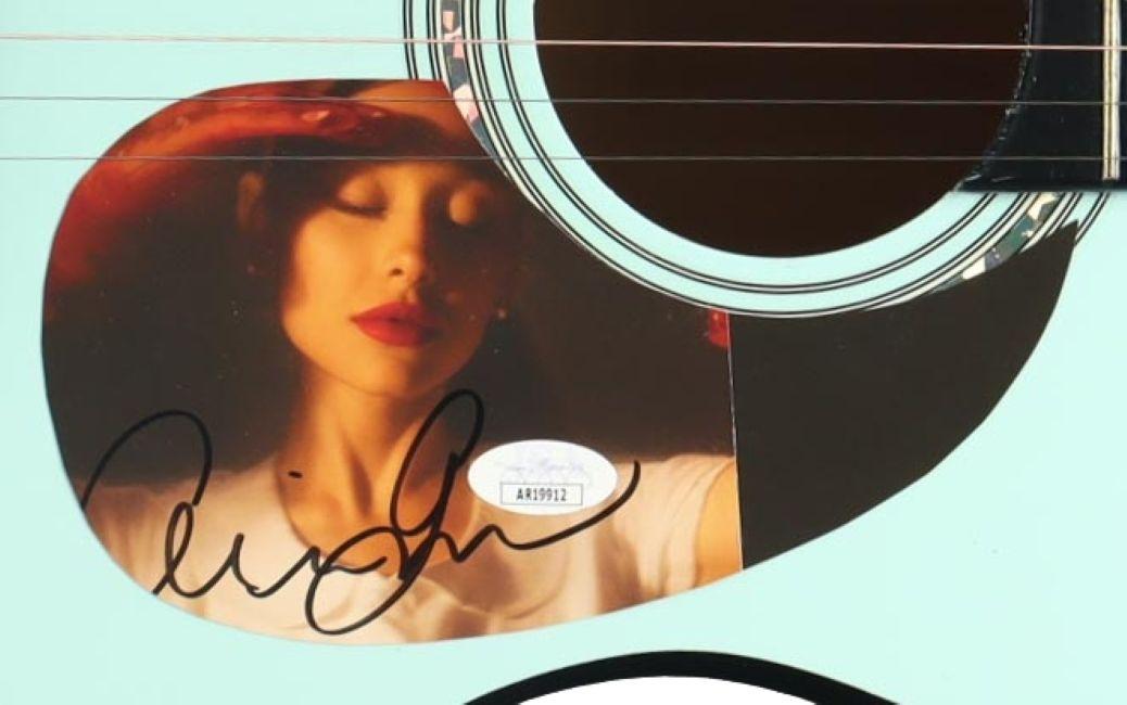 Ariana Grande acoustic guitar measures approximately 38" in length and has been hand-signed on the CD cover, repurposed as a pickguard, by Ariana Grande.
