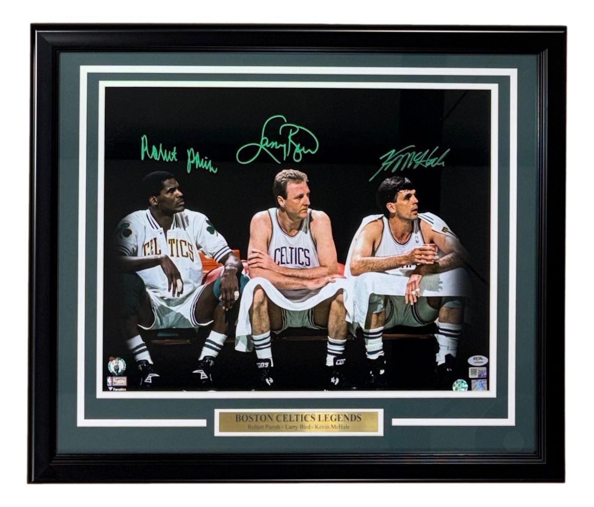 Larry Bird, Kevin McHale & Robert Parrish Signed Celtics Custom Framed Photo (PSA)