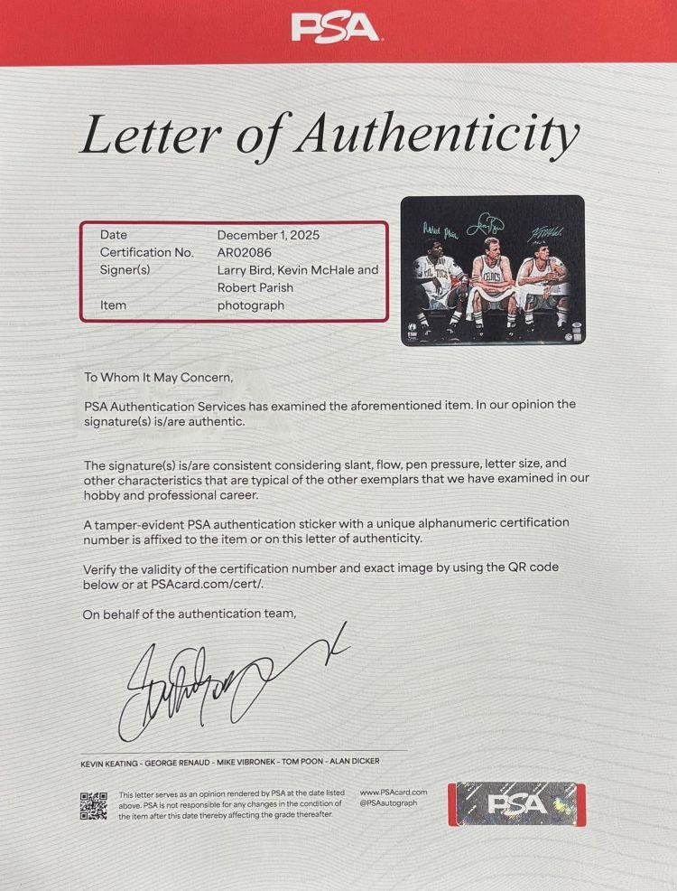 Custom frame measures 22” x 27” in size and features a photo that has been hand-signed by Larry Bird, Kevin McHale, and Robert Parrish (Boston Celtics, HOF).