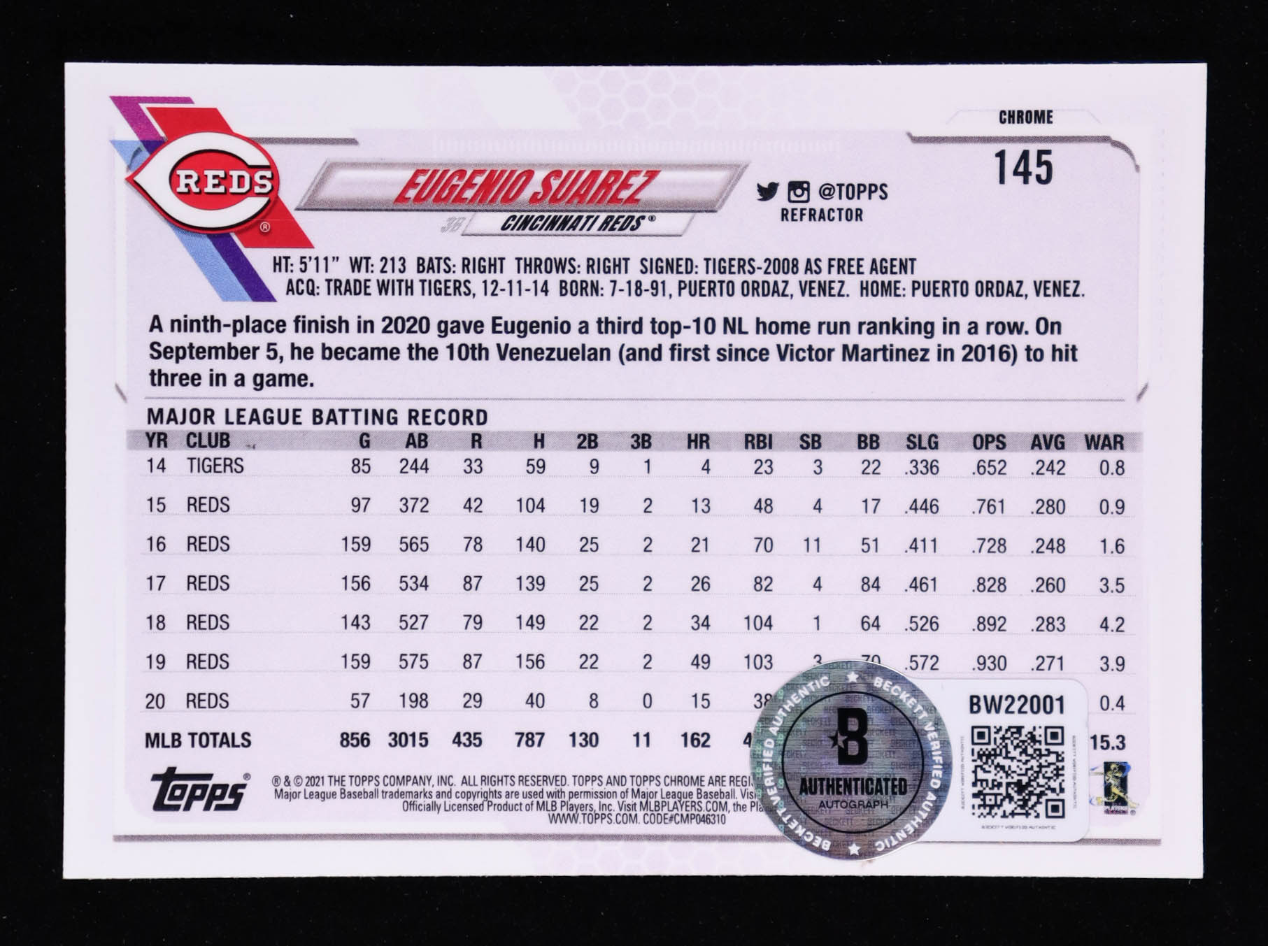 Eugenio Suarez Signed 2021 Topps Chrome Refractors #145 (Beckett)
