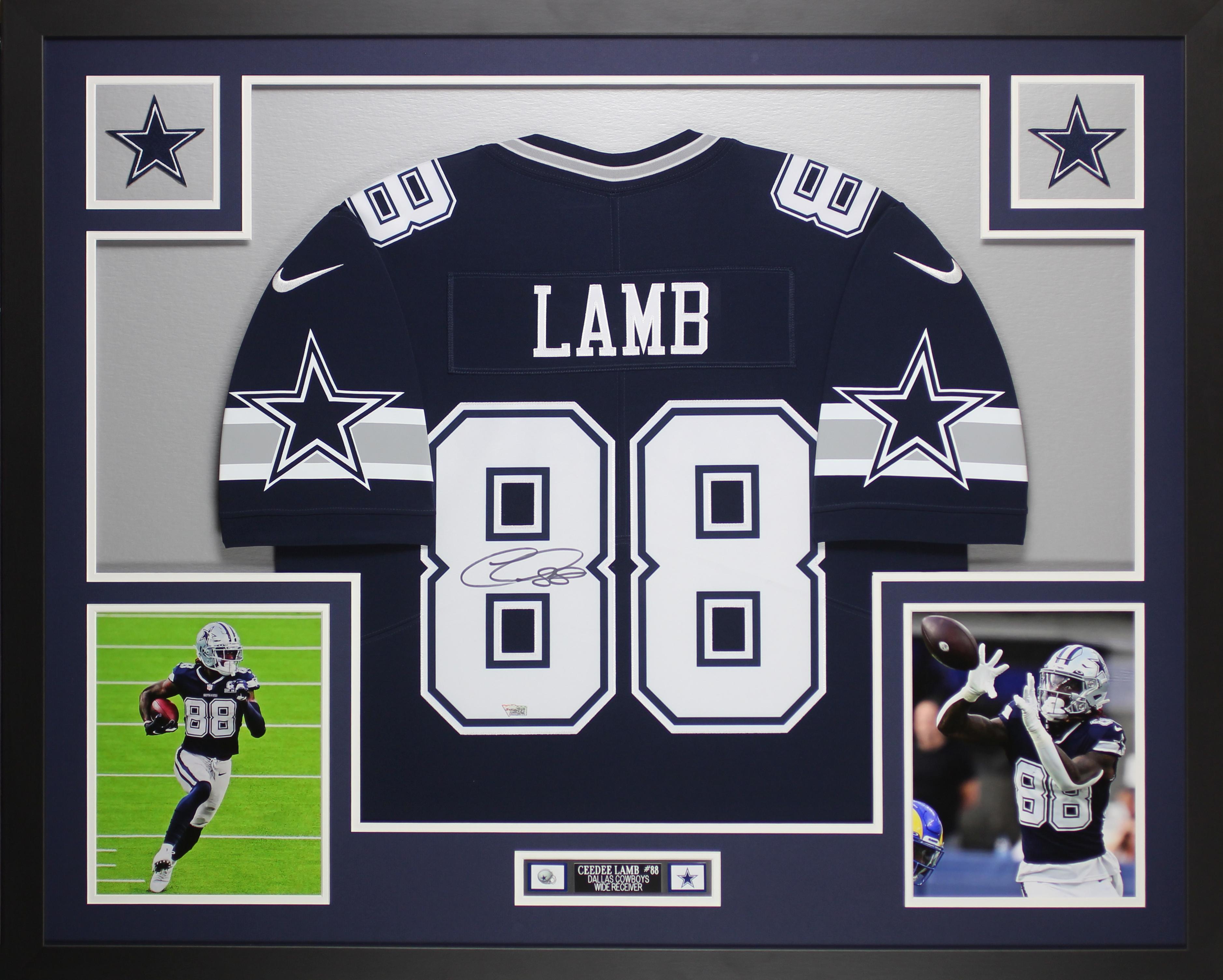 Custom framed display measures 35" x 43" in size and features a Nike jersey that has been hand-signed by CeeDee Lamb (Dallas Cowboys).