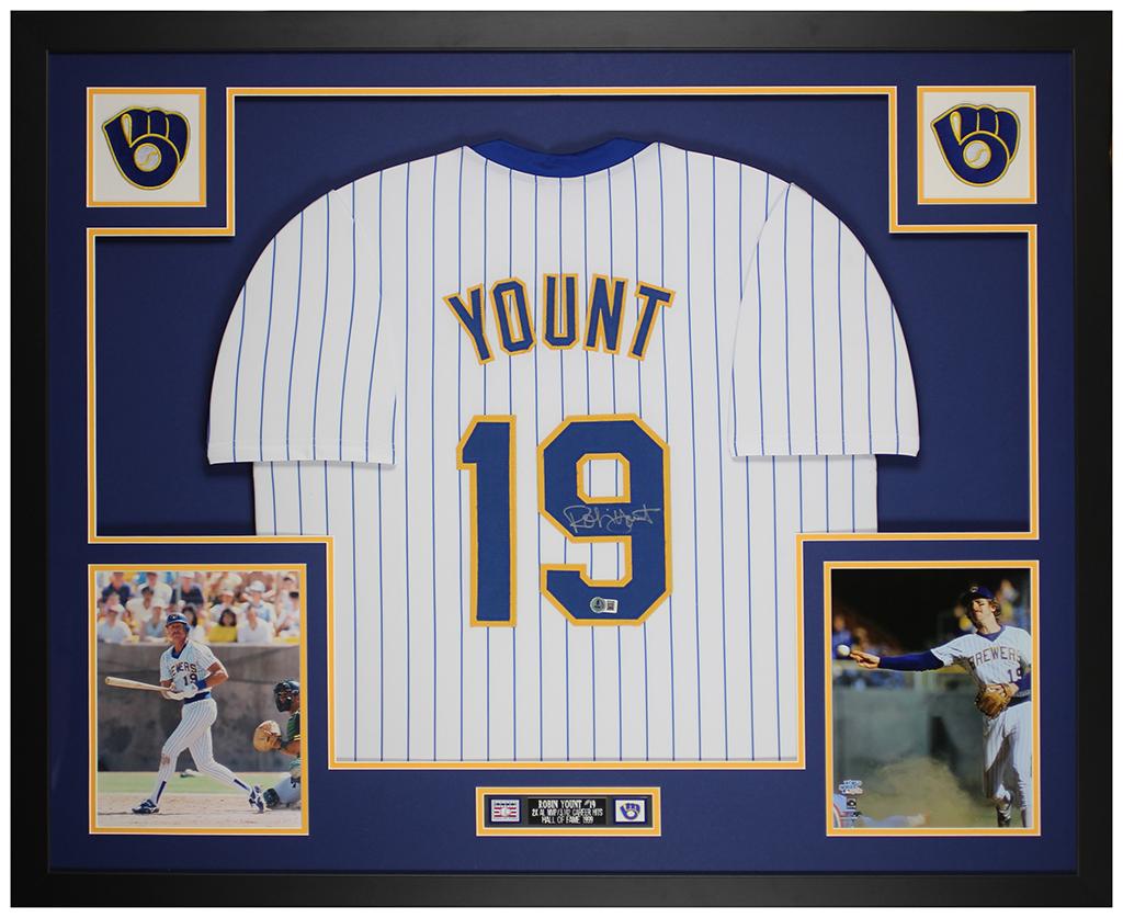 Custom frame measures 35" x 43" in size and features a jersey that has been hand-signed by Robin Yount (HOF).