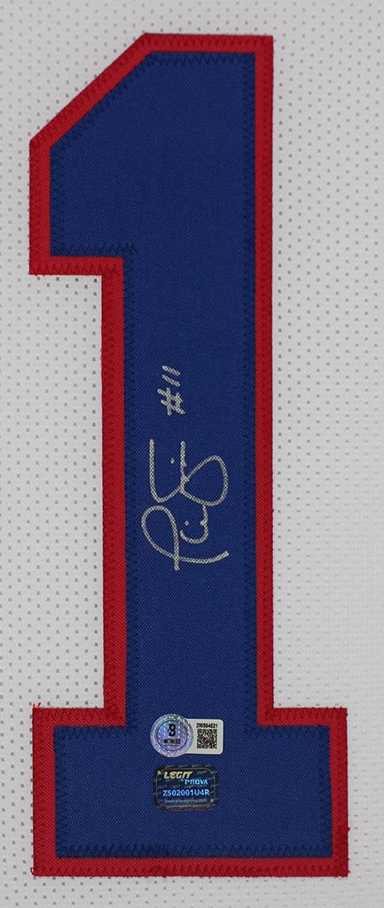 Custom frame measures 35" x 43" in size and features a jersey that has been hand-signed by Phil Simms.