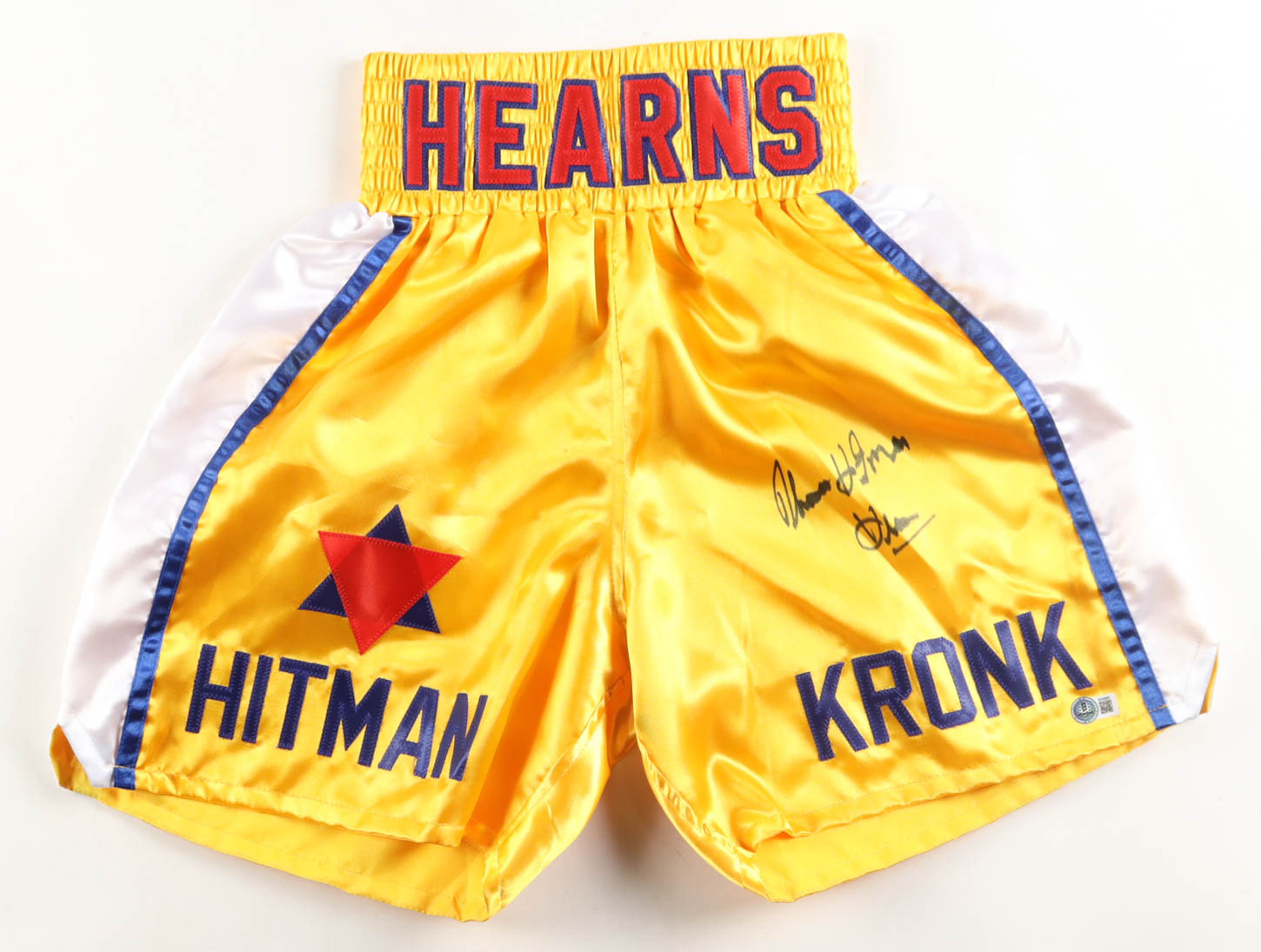 Thomas Hearns Signed Boxing Trunks Inscribed "Hitman" (Beckett)