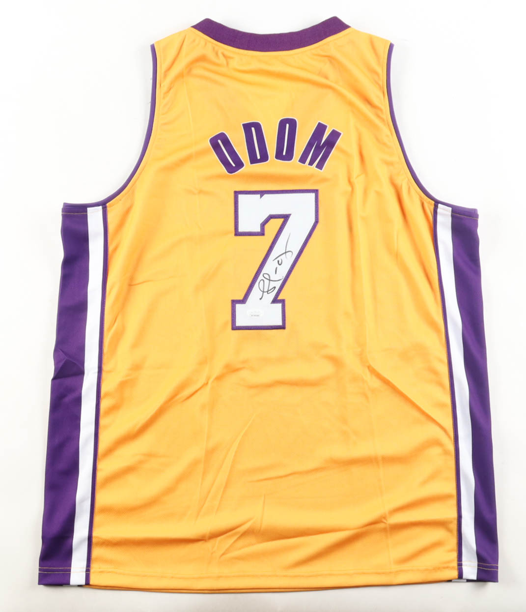 Custom jersey with everything sewn on, size L. Hand-signed by Lamar Odom.