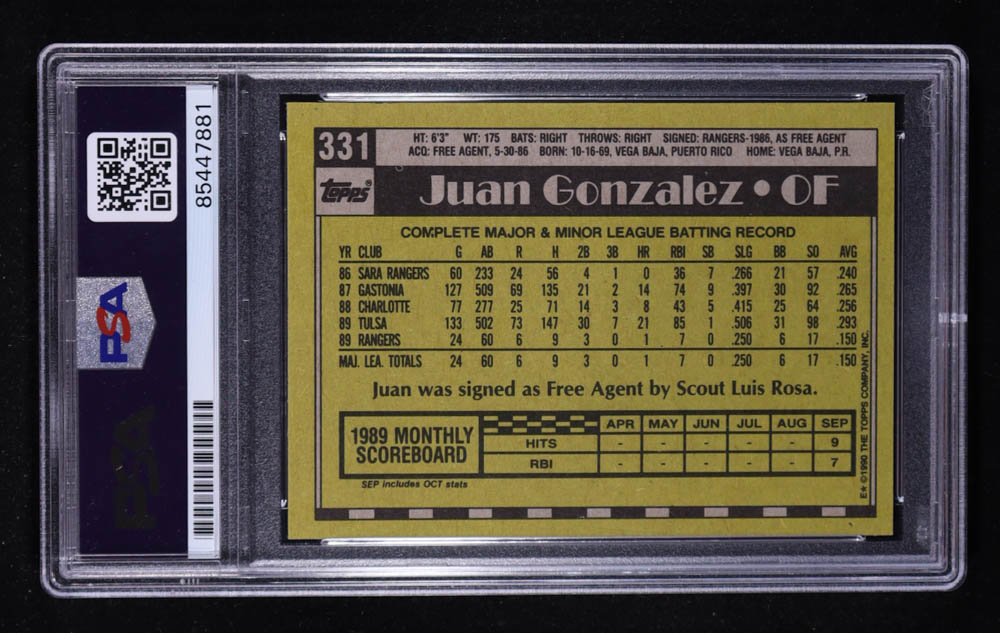 Juan Gonzalez Signed 1990 Topps #331 RC Inscribed "434 HRS" (PSA)
