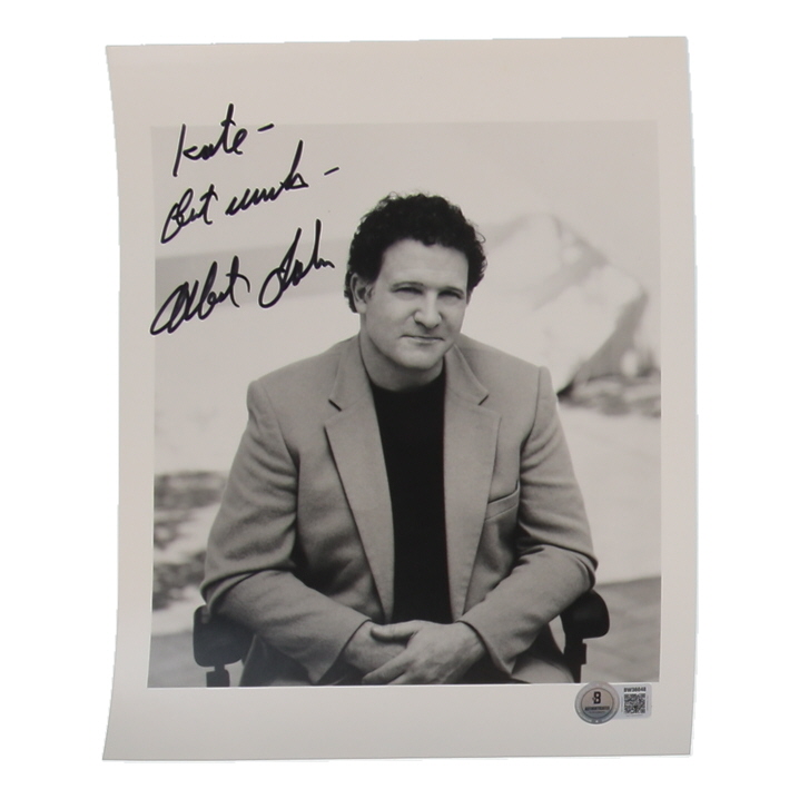 Photo measures 8" x 10" in size and has been hand-signed and inscribed by Albert Brooks. Please note, a personalization is made out to "Kate".