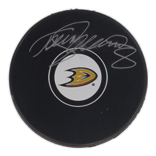 Anaheim Ducks Logo Hockey Puck. Hand-signed by Teemu Selanne (HOF). Please note, the signature has been smudged.