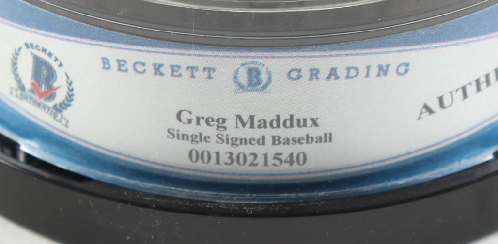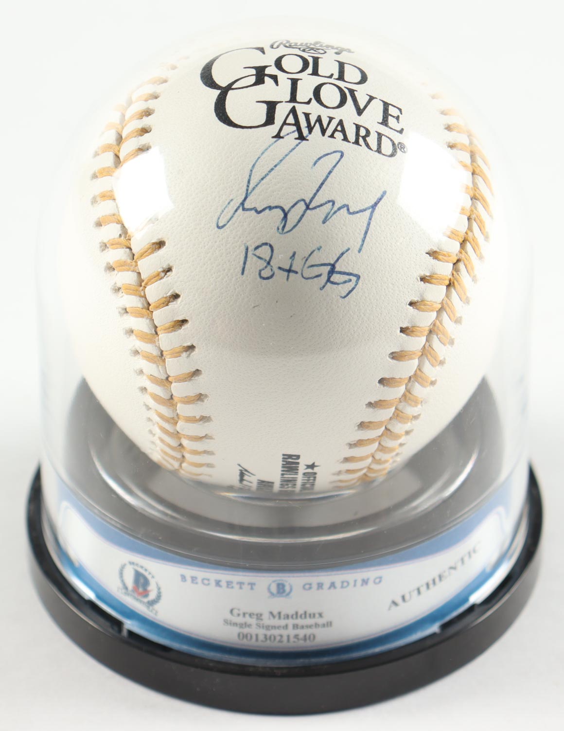 Greg Maddux Signed Gold Glove Logo Baseball With Beckett Display Case Inscribed "18x GG" (BGS Encapsulated)