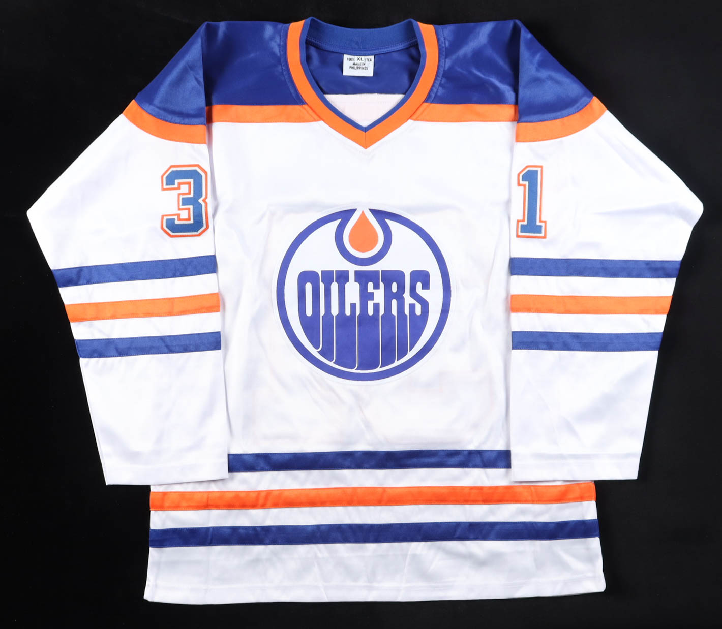 Custom jersey with everything sewn on, size XL. Hand-signed and inscribed by Grant Fuhr (HOF).