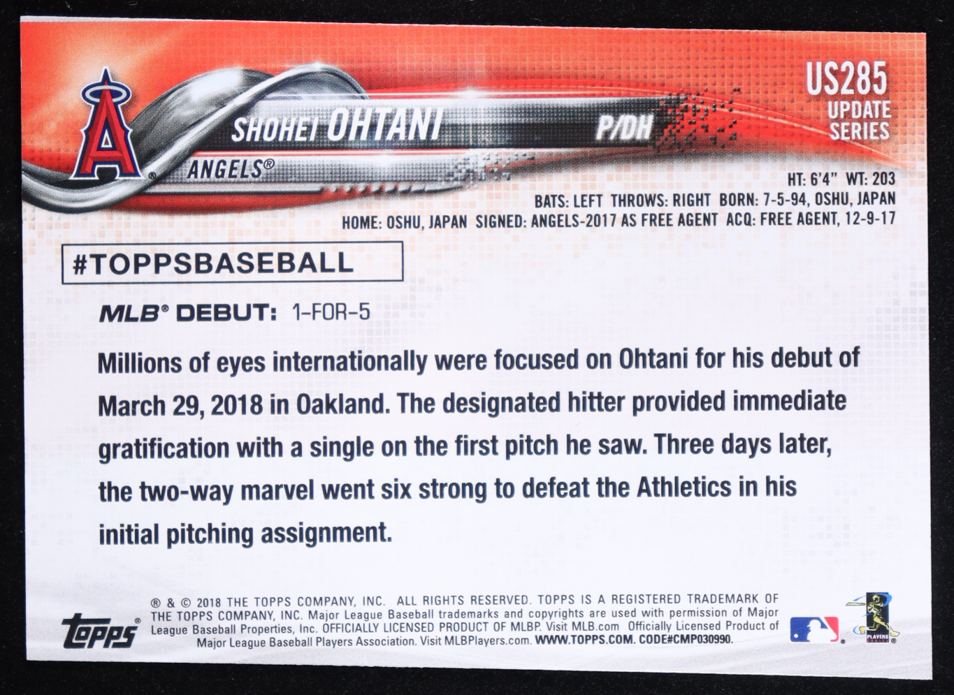Shohei Ohtani 2018 Topps Update #US285 RD RC