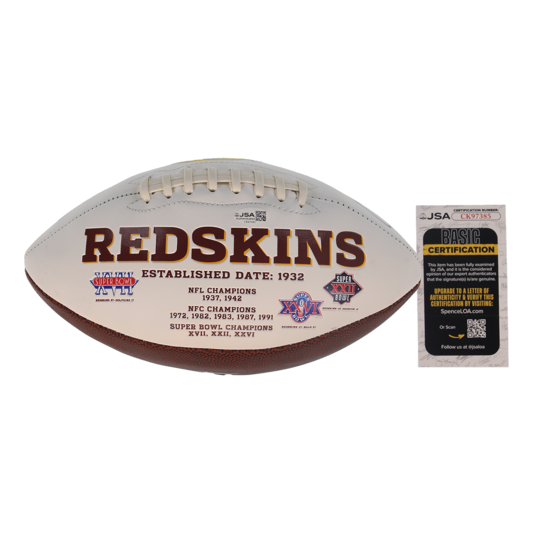 Washington Redskins Logo Football. Hand-signed and inscribed by Joe Theismann. Please note, the signature has bled and there are stains throughout the football.