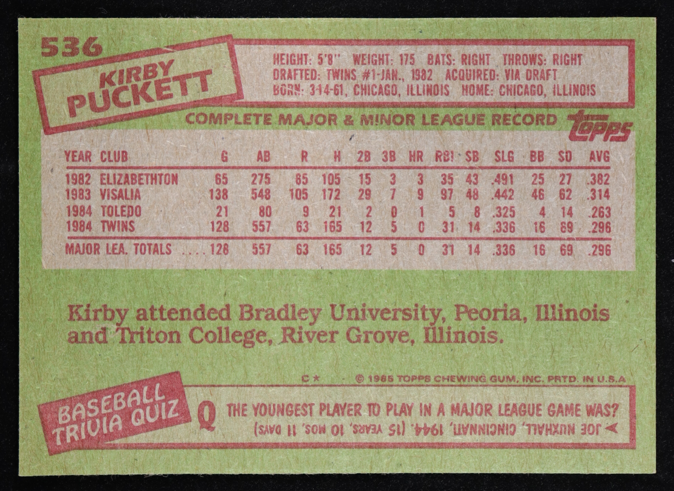Kirby Puckett 1985 Topps #536 RC