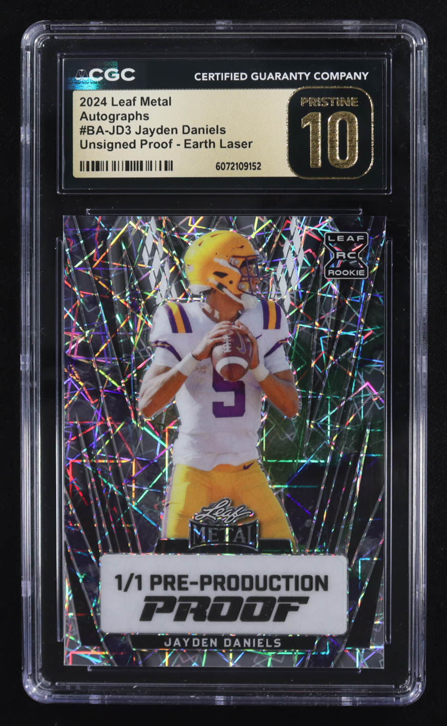 Jayden Daniels 2024 Leaf Metal Autographs Earth Laser Pre-Production Proof XRC Unsigned #BA-JD3 RC #1/1 (CGC | Black Label Pristine 10)