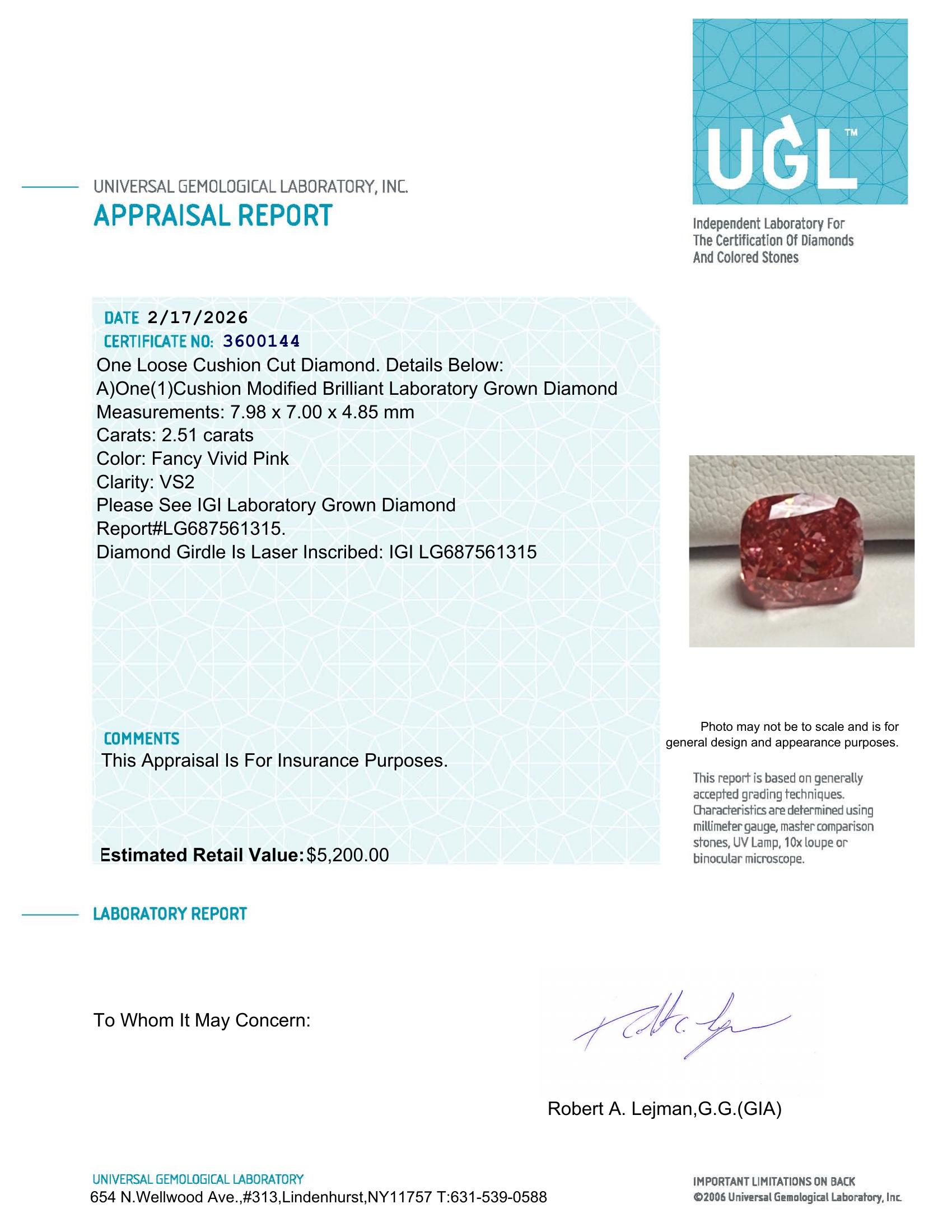2.51 Carats Lab Grown FANCY VIVID PINK Diamond Loose VS2 | $5,200 Estimated Retail Value (UGL & IGI Certs) | Cushion Cut