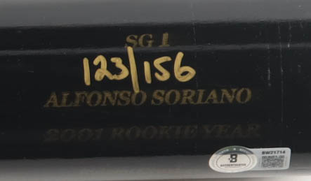 Sam Bat Rookie Year Player Model Baseball Bat. Hand-signed by Alfonso Soriano (New York Yankees). The bat is limited edition and has been hand-numbered #123/156.