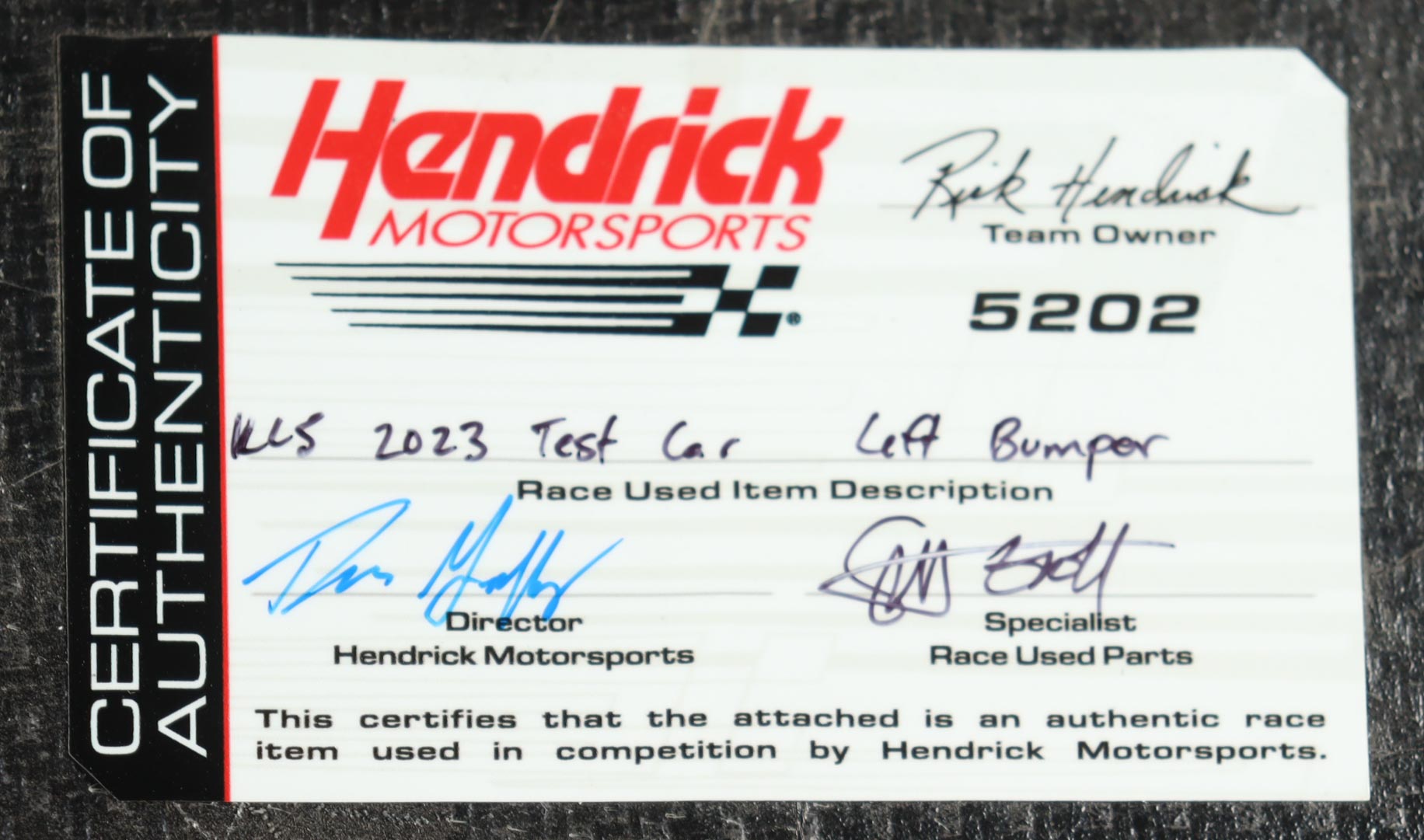 Race-Used Left Bumper Car Piece from Kyle Larson's #5 Test Car during the 2023 NASCAR Cup Series. Authenticated by the Director and Race Used Parts Specialist at Hendrick Motorsports.