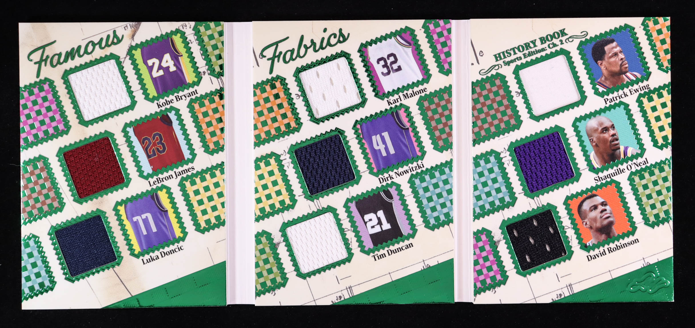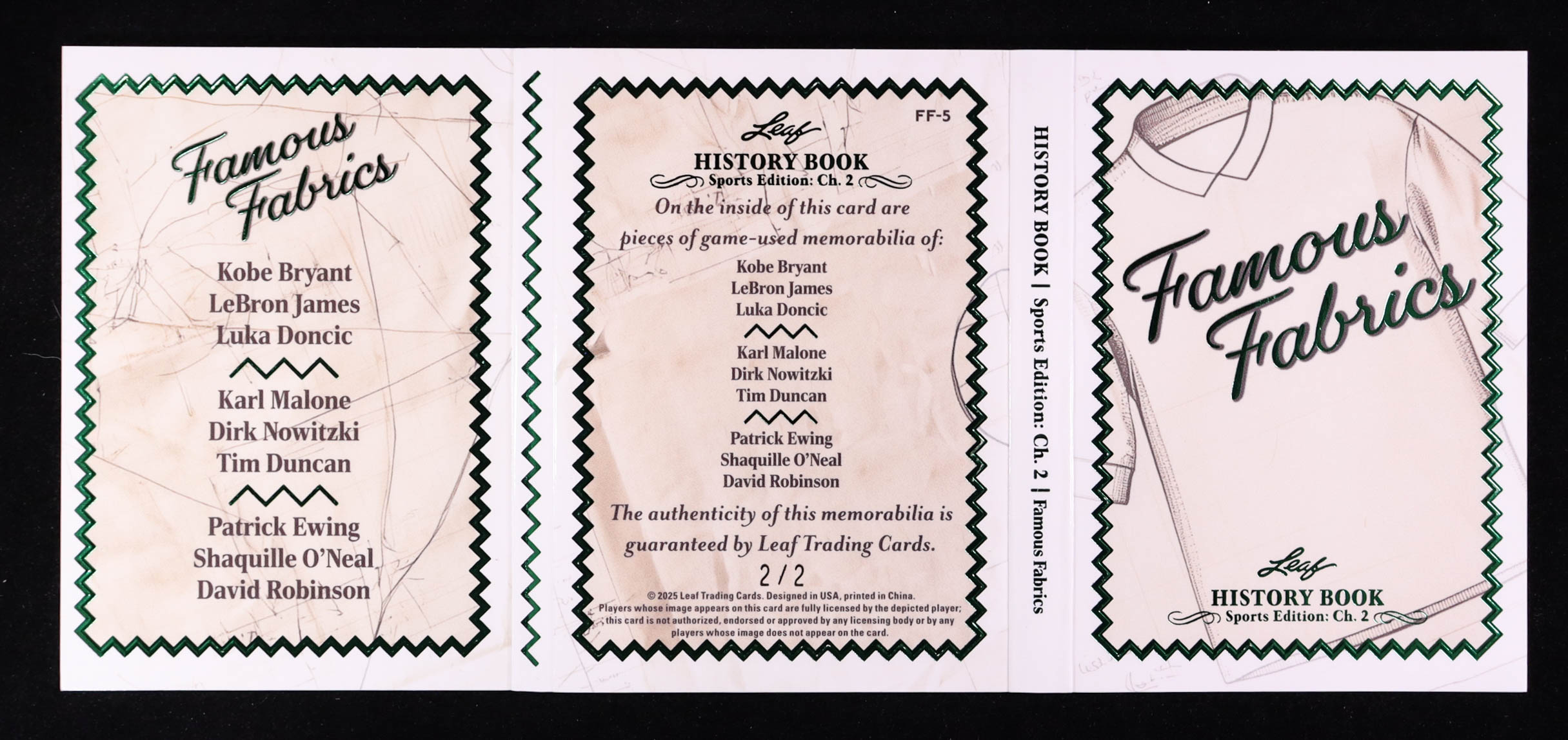 Kobe Bryant / LeBron James / Luka Doncic / Karl Malone / Dirk Nowitzki / Tim Duncan / Patrick Ewing / Shaquille O'Neal / David Robinson 2025 Leaf History Book Sports Edition Chapter 2 Famous Fabrics Green #FF5 #2/2