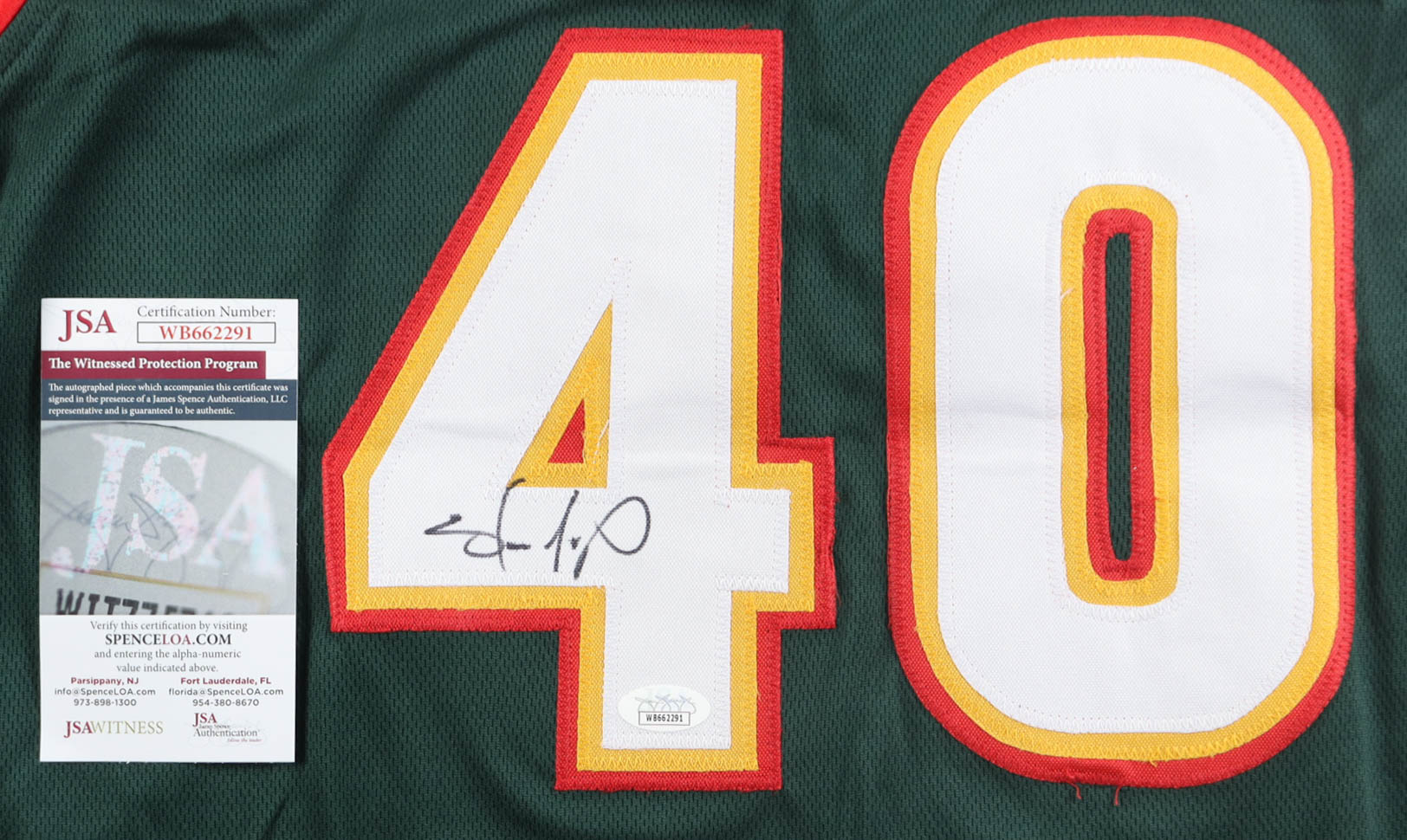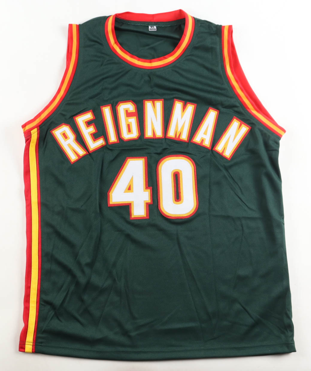 Custom jersey with everything sewn on, size XL. Hand-signed by Shawn Kemp (Seattle SuperSonics).