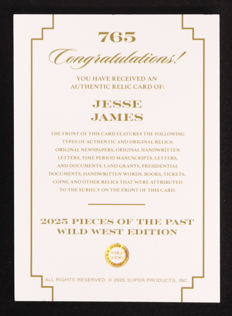Jesse James 2025 Pieces of the Past Wild West Edition Jumbo Relic #765