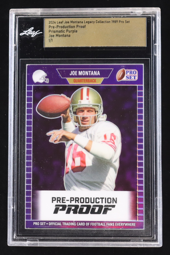 Joe Montana 2024 Leaf Joe Montana Legacy '89 Pro Set Pre-Production Proof Prismatic Purple #NNO #1/1 (Leaf Encapsulated)