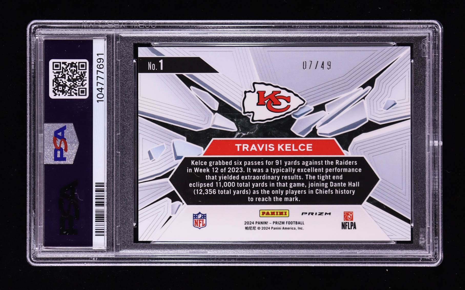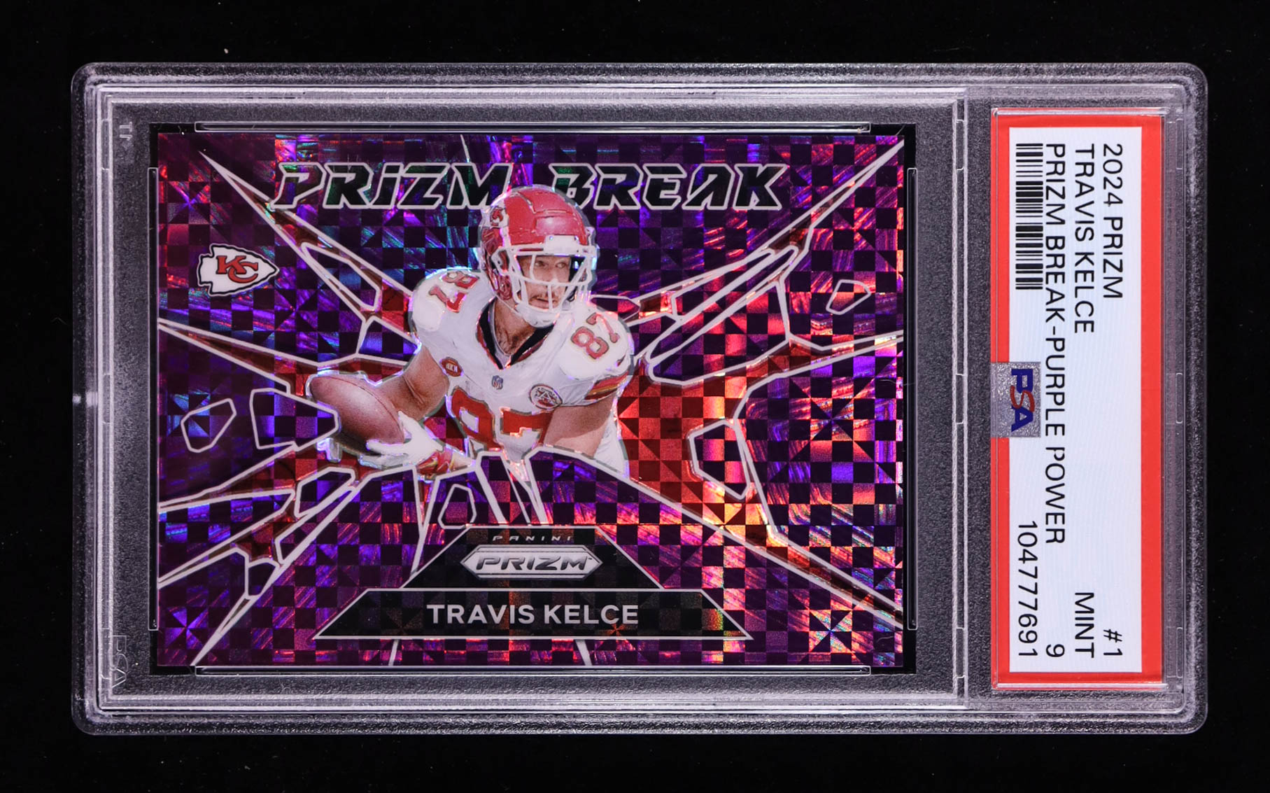 Travis Kelce 2024 Panini Prizm Prizm Break Prizms Purple Power #1 #7/49 (PSA 9)