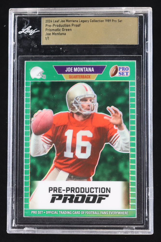 Joe Montana 2024 Leaf Joe Montana Legacy '89 Pro Set Pre-Production Proof Prismatic Green #NNO #1/1 (Leaf Encapsulated)