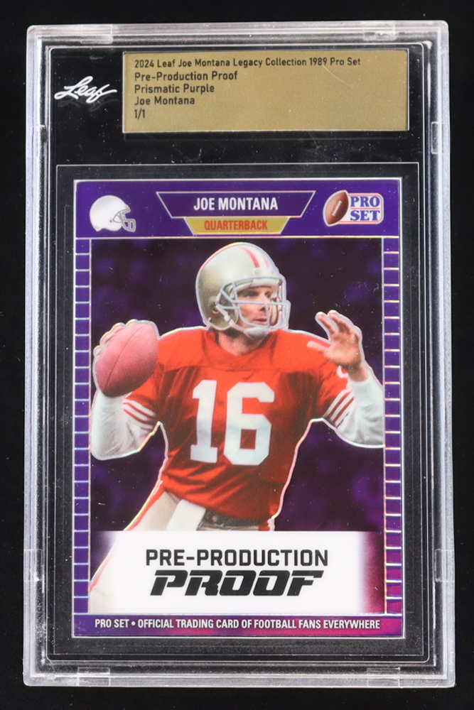 Joe Montana 2024 Leaf Joe Montana Legacy '89 Pro Set Pre-Production Proof Prismatic Purple #NNO #1/1 (Leaf Encapsulated)